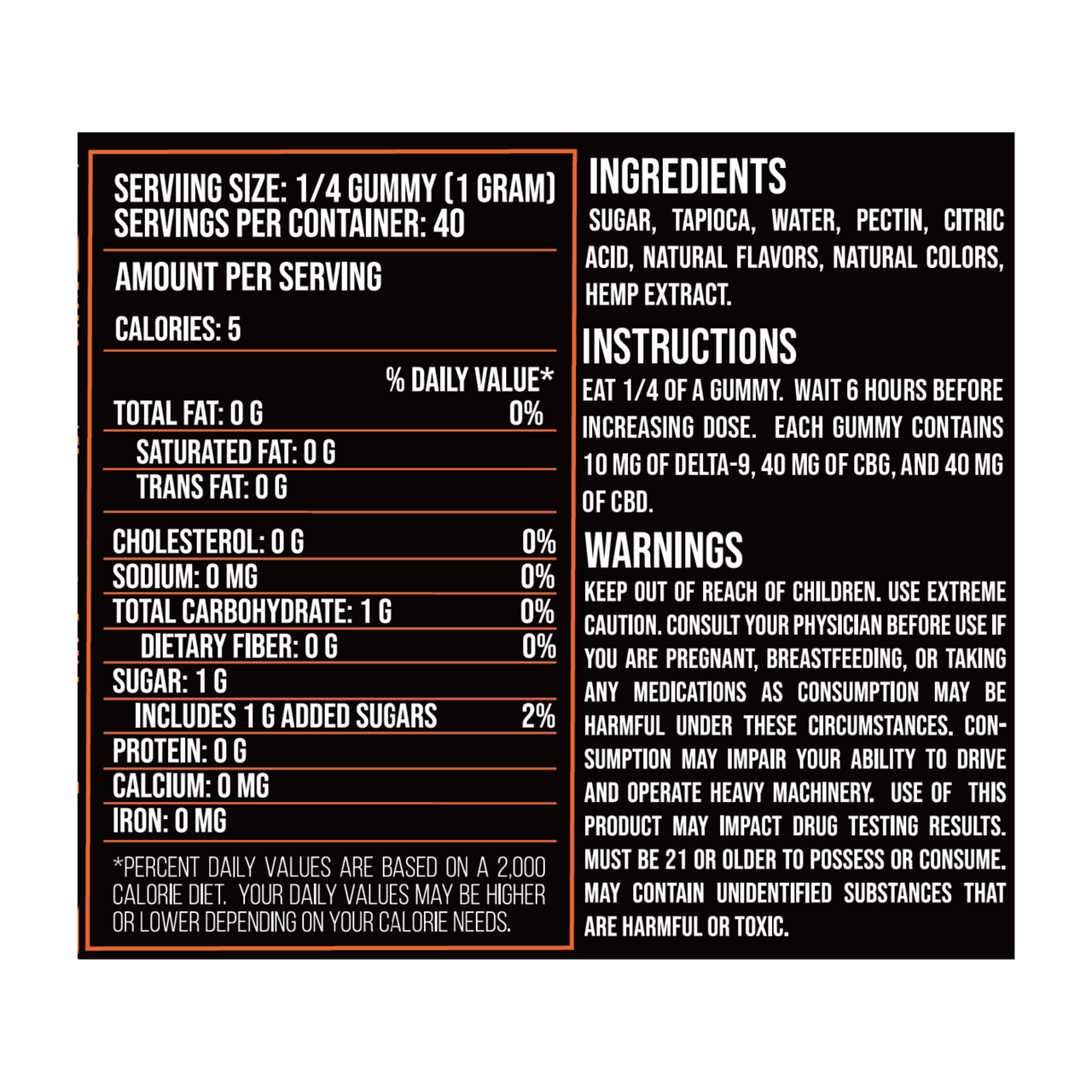 Packing a serious punch, this is what your muscles and joints ordered. A full 10 mg of Delta 9, 40 mg of CBG, and 40 mg of CBD per gummy, these were designed to get you feeling better.
