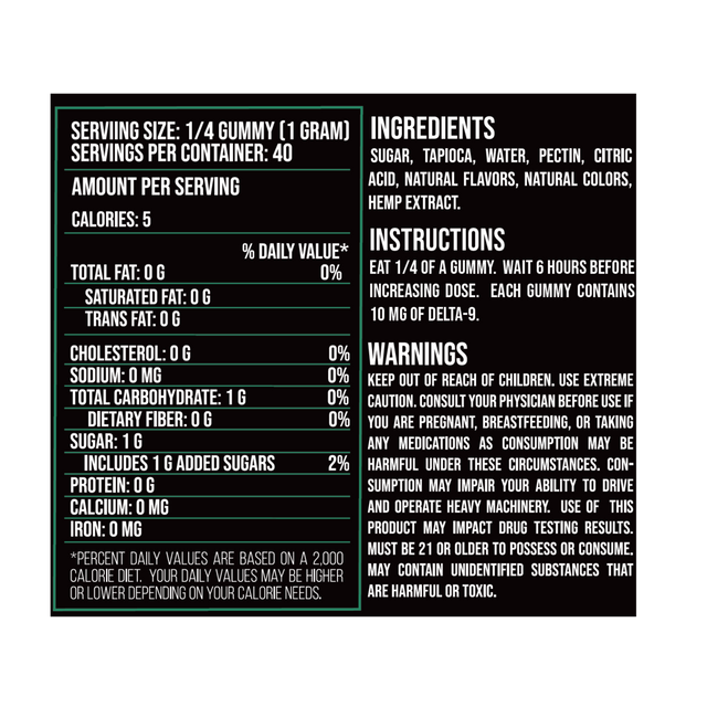 Delta-9 is a hemp derived extract that can be intoxicating to some users. It is important to start slow and be mindful when taking Delta-9 products. Each gummy contains 10mg of Delta-9.